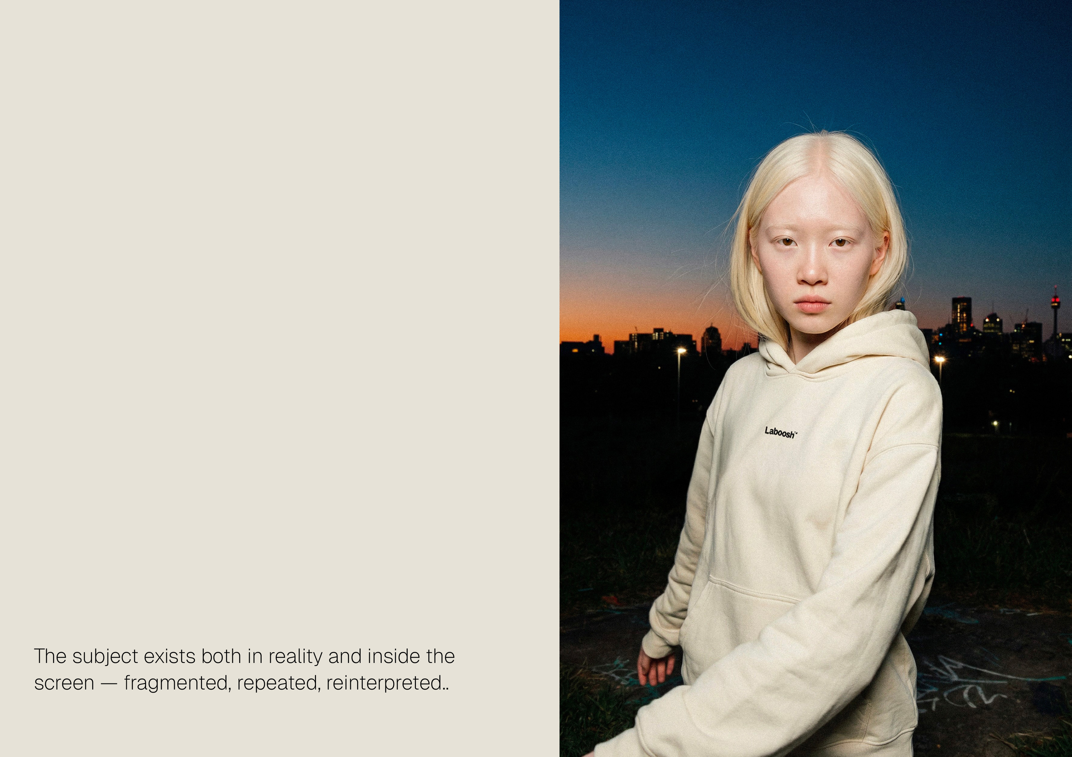 Screen Generation — AI Fashion EditorialEditorial visual exploration investigating how contemporary identity is constructed, observed and multiplied through media.Set within an urban environment at dusk, the project creates a visual tension between physical presence and digital representation. Analog screens become central narrative elements — not just objects, but devices that isolate, fragment and reinterpret the subject, transforming both body and product into visual signals.The creative direction is built around a controlled and minimal editorial aesthetic, where styling, lighting and composition work together to create a cohesive and recognizable visual language. The contrast between the raw urban setting and the clean, almost detached presence of the subject reinforces the dialogue between past and present.Through the integration of AI image generation and post-production, the project explores a balance between realism and constructed imagery, positioning itself between photography, simulation and contemporary visual culture.