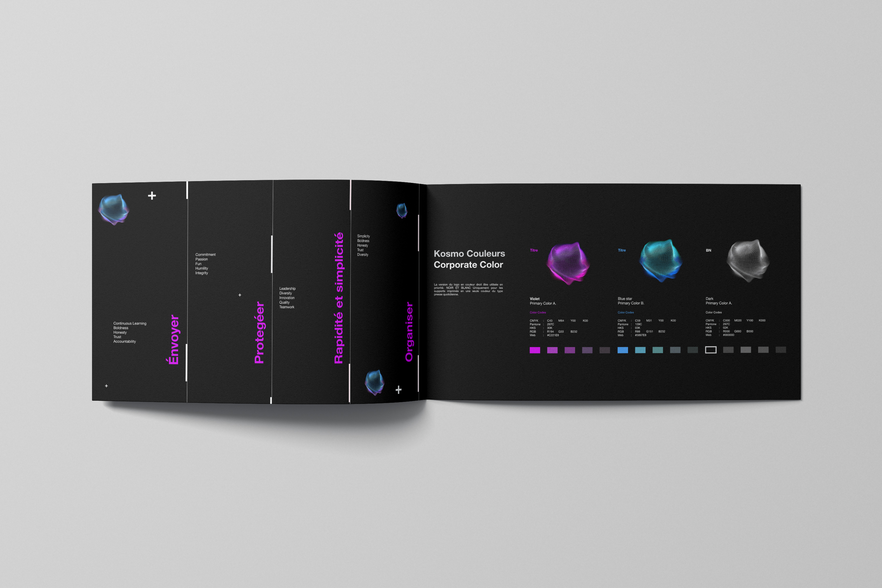Kosmo, an innovative digital document management service, is undergoing a visual identity restyling. The restyling is ongoing: the new identity is being adapted across digital and print materials, ensuring a smooth and consistent transition. This refreshed visual identity strengthens Kosmo’s market presence while conveying trust and professionalism to its clients.The brand graphics were designed to ensure visual coherence across all touchpoints. A professional, restrained color palette and minimalist graphic elements communicate security and innovation, with clear and functional layouts. I designed the logo and brand graphics to convey modernity, security, and visual consistency.